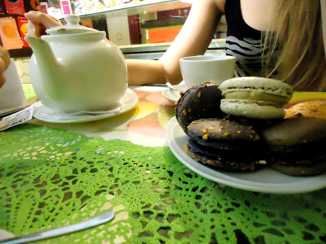 No olviden acompañar los macarons con un Té Negro exótico -todos están debidamente detallados en el menú-, un tradicional English Breakfast (blend de té negro en general servido con leche), un Espresso o Café con crema. Otras variantes del cafè, como Macchiato, Moca o Cappuccino, serían para aquellos que no tienen miedo en empalagarse, pues son demasiado dulces, suaves o cremosos, lo que hace que la composición total pueda llegar a tener consecuencias nefastas. Por ello, mejor acompañar con un té o infusiones ricas en hiervas fuertes (vergamota, mejorana, cilandro), especias (canela, cinnamon, nuez moscada, cardamomo) o frutas (manzana, limón o naranja dulce, frutilla), o café negro con, como mucho, algo de crema. Todas estas bebidas contienen ingredientes que acrecientan vigor y por ello acompañan de forma magnífica la dulzura -y en algunos casos el agrio- de los macarons.