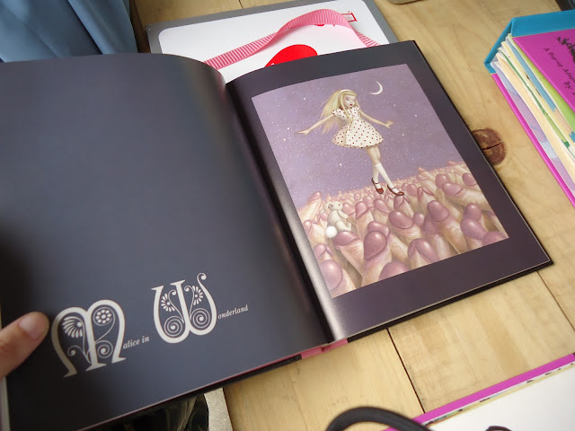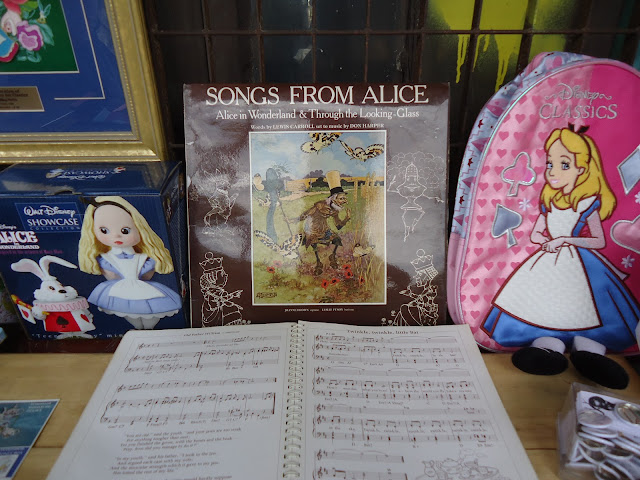 Entre la colección podías ver e incluso tocar y leer libros y cómics, algunos de ellos autografiados, como la versión semi erótica y siempre psicodélica "Alice" de Trevor Brown, Songs From Alice de 1921, Cuentos Silenciosos de Benjamin Lacombe, adaptaciones del cuento de Glenda Sburelin y Abelardo Morell, Doolybird (un volumen sobre muñecas estilo dollfie de Alice in Wonderland) y , también sellos postales, monedas de plata, estatuillas y figuras (entre ellas las de Mary Blair), litografías originales de Dalí, tarjetas telefónicas, postales, estampillas y hasta manuscritos, y no olvidemos mencionar el Wonderland Postage Stamp Case, uno de los seguramente primeros clasificadores de sellos que haya existido, el cual es un pequeño tesoro y una de las piezas más preciadas de la colección.
