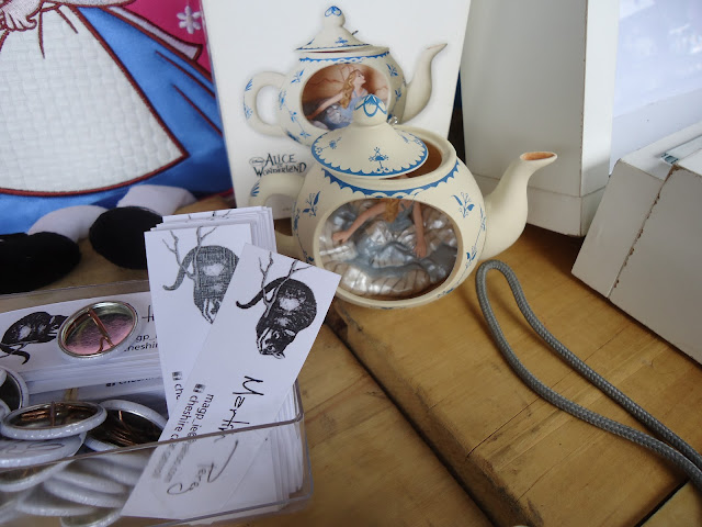 También había un puesto de vestidos lolita y medieval por parte del stand de Devlin Belacqua, muchos de pines con y sin temática aliciesca, peluches de anime, replicas de armas blancas y de fuego, merchandising de rol, remeras y todo eso que siempre hay en eventos similares...