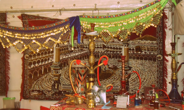 Pipas Narguiles y shāwarmās caracterizando como siempre estos locales.